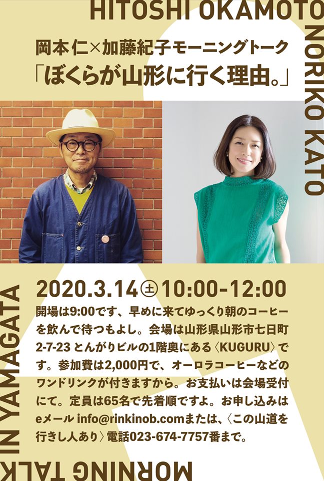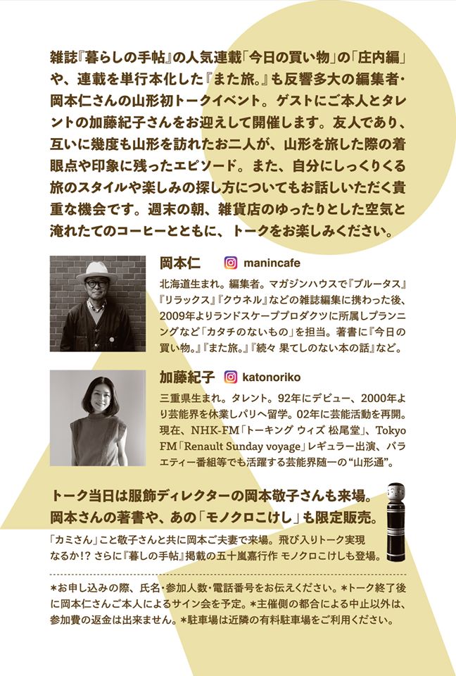 雑誌『暮しの手帖』の人気連載 「今日の買い物」の「庄内編」や、連載を単行本化した『また旅。』も反響多大の編集者・岡本仁さんの山形初トークイベント。ゲストにご本人とタレントの加藤紀子さんをお迎えして開催します。友人であり互いに幾度も山形を訪れたお二人が、山形を旅した際の着眼点や印象に残ったエピソード、また自分にしっくりくる旅のスタイルや楽しみの探し方についてもお話しいただく貴重な機会です。週末の朝、雑貨店のゆったりとした空気と淹れたてのコーヒーとともに、トークをお楽しみください。